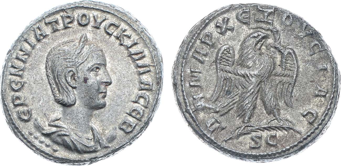 Серебро. 12,76г. Антиохия. Аверс: круговая легенда; портрет императрицы в лавровом венке - вправо. Реверс: круговая легенда; изображение орла с распростёртыми крыльями - вправо. Prieur 618. Dura Hoard 50.. AU.