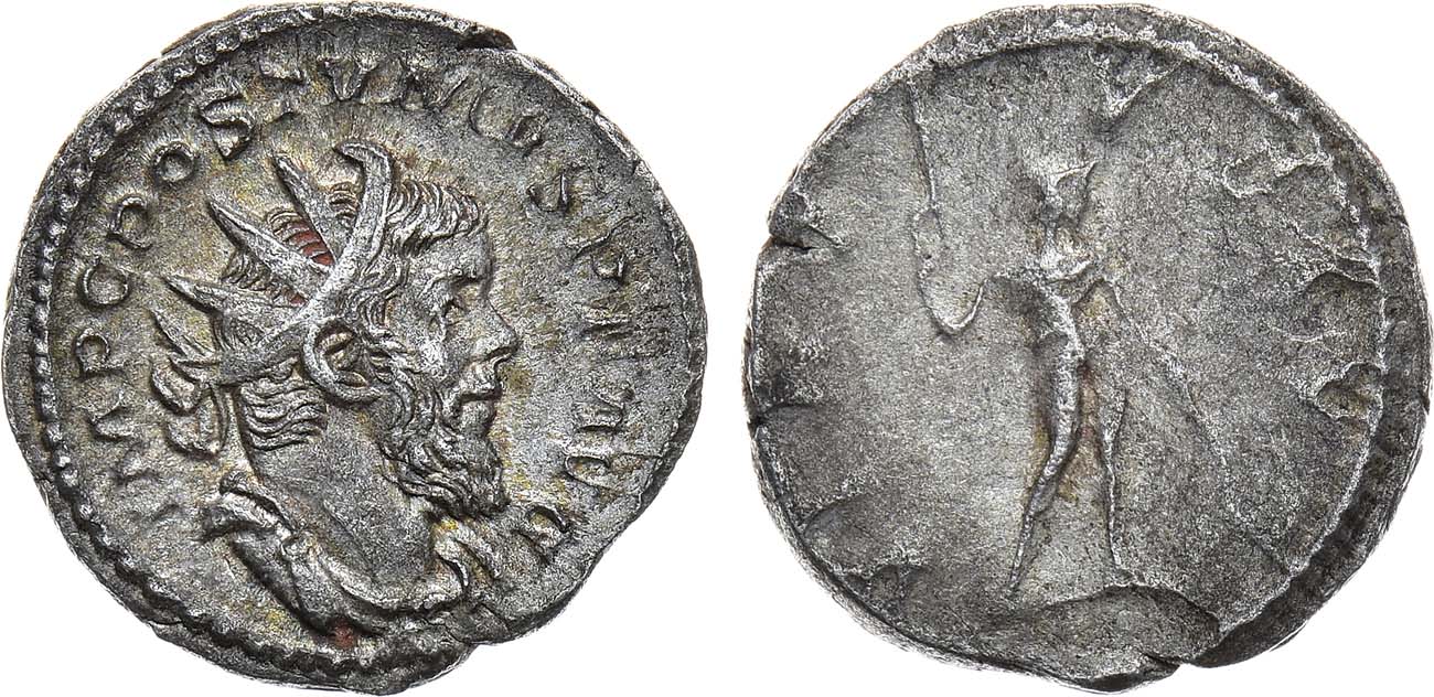 Серебро. 3,29г. Кёльн. Аверс: круговая легенда "IMP C POSTVMVS P F AVG"; портрет императора в короне вправо. Реверс: круговая легенда "COS IIII"; ростовое изображение богини Виктории, обращённой вправо. Sear 10939. RIC 303. RSC 65. Hunter 55. AU.