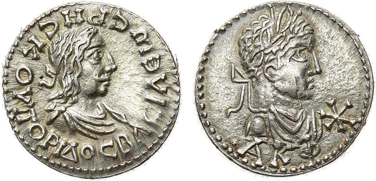 Электр. 7,61г. Пантикапей. Аверс: портрет царя - вправо, круговая легенда на греческом "ВАСIΛЄѠC РНСКОVПОРIΛОС". Реверс: портрет императора в лавровом венке вправо. Перед ним дифферент "звезда". Под портретом греческие буквы, обозначающие дату боспорской эры. AU.