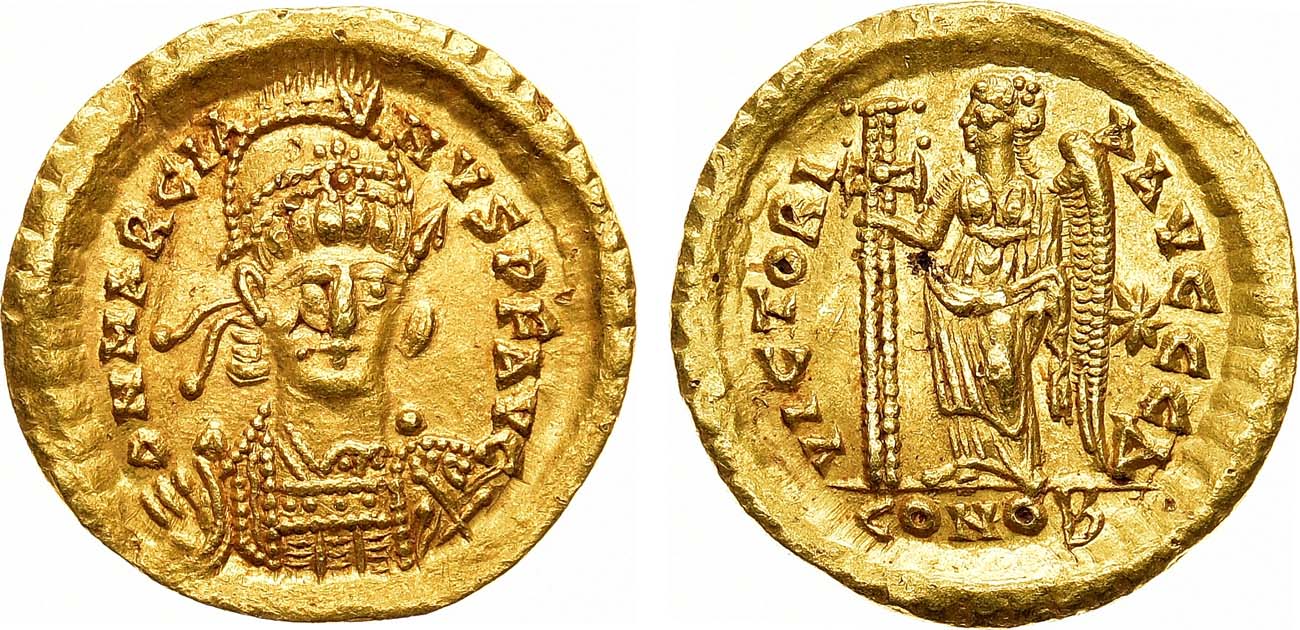 Золото. 4,44г. Константинополь. Аверс: круговая легенда "DN MARCIA-SIVS PP AVC"; портрет императора в военных доспехах, с копьём на правом плече. Реверс: круговая легенда "VICTORI-A-AVCCC А"; изображение богини Виктории влево, с большим украшенным крестом; справа на поле звезда; под линией обреза "CONOB". Sear 21379. AU/UNC.