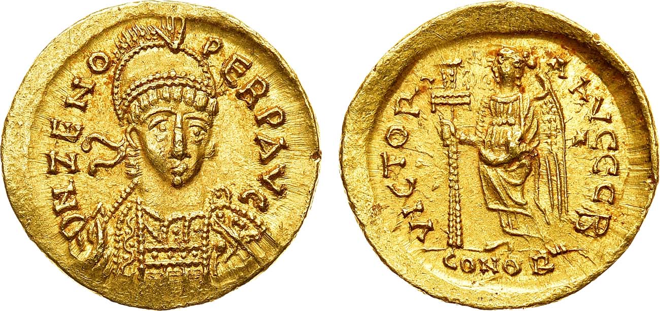 Золото. 4,49г. Константинополь. Аверс: круговая легенда "DN ZENO P - ERP AVC"; изображение императора анфас в военных доспехах с копьём и щитом. Реверс: круговая легенда "VICTORI AAVCCC В"; изображение богини Виктории влево, с большим украшенным крестом; справа на поле звезда; под линией обреза "CONOR". Sear 21514. UNC.