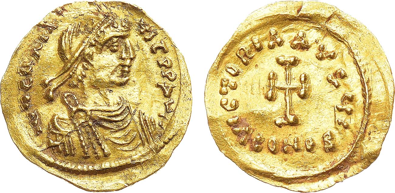 Золото. 4,48г. Константинополь. Аверс: круговая легенда "DN MAVRC-TIb PP AVC", портрет императора анфас в военном шлеме с перьями и державой с крестом в правой руке. Реверс: круговая легенда "VICTORI-A AVCCГ"; Ангел анфас с увенчанным хризмой посохом в правой руке и державой с крестом - в левой, внизу под линией обреза "CONOB". Sear 478. Sommer 7.5. UNC.