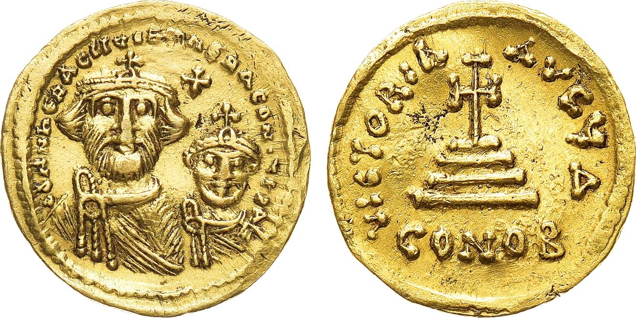 Золото. 4,46г. Константинополь. Аверс: круговая легенда "ddNN hЕRACLIЧS ЕT hЕRA CONST PP AV"»; портреты императоров Ираклия и Ираклия Константина анфас. Реверс: круговая легенда: "VICTORIA AV ГЧE", Крест на алтаре из 4 ступеней. внизу "CONOB". Sear 738. Sommer 11.9.2. AU.