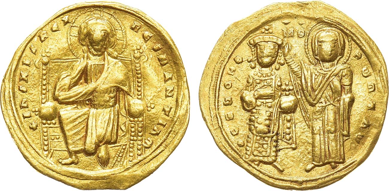 Золото. 4,33г. Константинополь. Аверс: круговая легенда "+hS XIS REX - RESNANTIhm"; изображение Христа на троне с поднятой правой рукой и Евангелием в левой. Реверс: круговая легенда "ѲCEhOHѲ - RWMAhW"; изображение Богоматери, возлагающей корону на императора. Sear 1819. Sommer 43.2. VF.