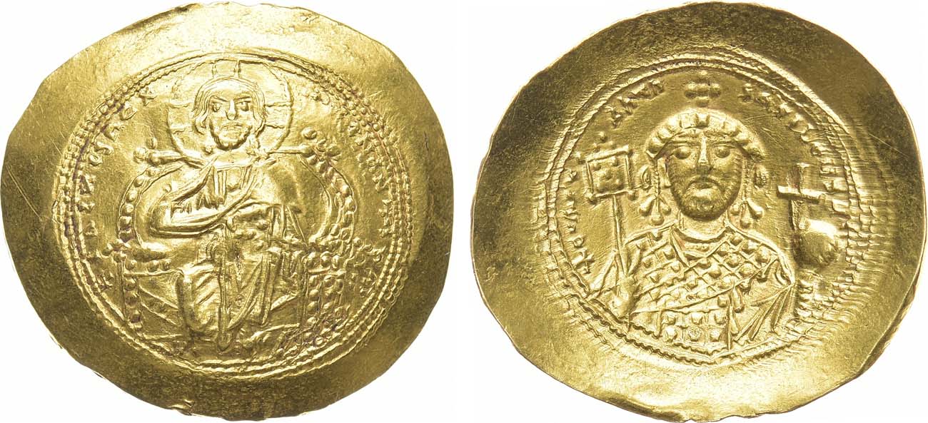 Золото. 4,33г. Константинополь. Аверс: круговая легенда "+ IhS XIS RЄX-RЄGNANTIПM"; тронное изображение Иисуса Христа с поднятой правой рукой и Евангелием - в левой, двойной точечный ободок. Реверс: круговая легенда "+CWh-STAhTh--bASILЄЧS RM", портрет императора Константина в короне с крестом, с лабарумом в правой руке и державой - в левой. Sear 1829. Sommer 48.2. AU/UNC.