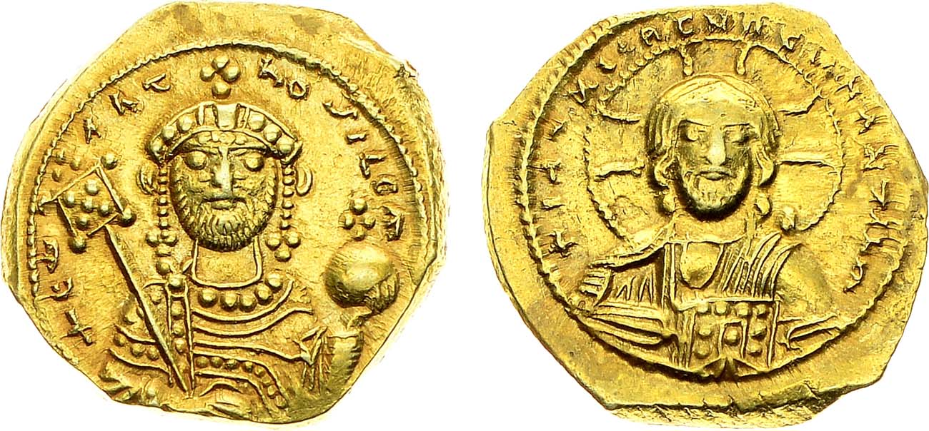 Золото. 4,06г. Аверс: Иисус Пантократор анфас с Евангелием в руках; легенда "+ IҺS XIS RЄX RЄgNANTIҺM". Реверс: портрет императора анфас с бородой, с лабарумом в правой руке и державой с крестом в левой; легенда "CWhSTAnTnOS LE RM". Sear 1833. Sommer 48.6. AU.
