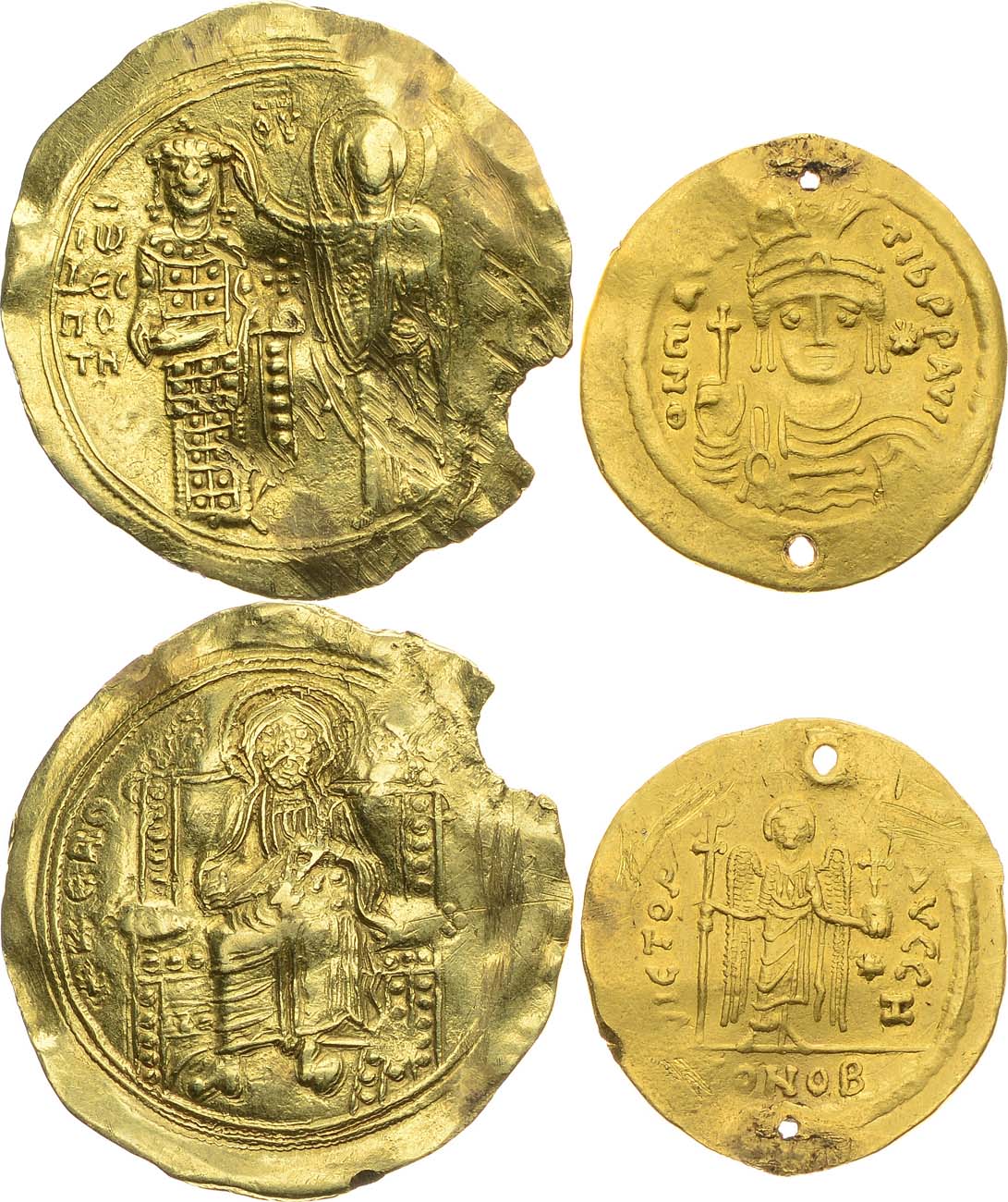 Золото. Византийская империя. Император Иоанн II Комнин. Гиперпирон 1118-1143 гг. 4,2 г. Sear 1940. Sommer 60. Отсутствие участка монеты, следы механической обработки. VF. Византийская империя. Император Флавий Маврикий Тиберий Август . Солид 583-602 гг. 4,22 г. Sear 481. Sommer 7.10. Сквозные отверстия на 6 и 12 часов, следы подвески. VF VF.