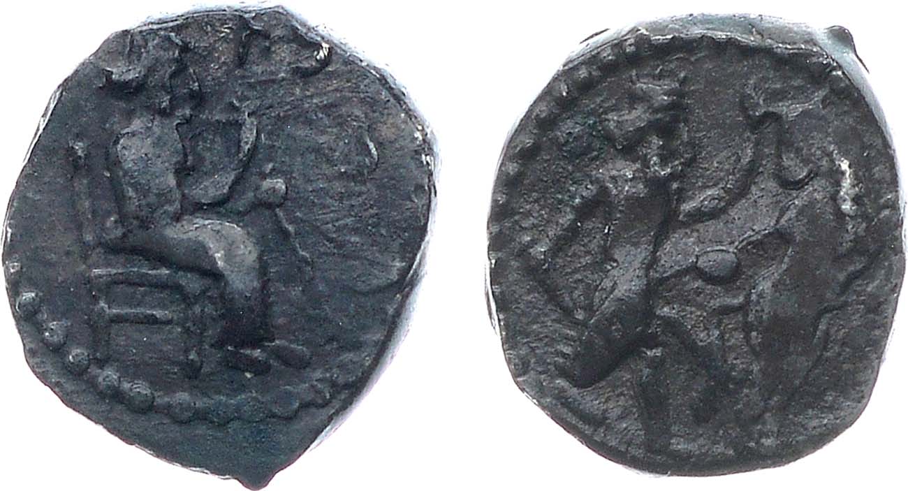 Серебро. 0,64г. Аверс: персидский царь сидит на троне. Реверс: персидский царь убивает быка. VF.
