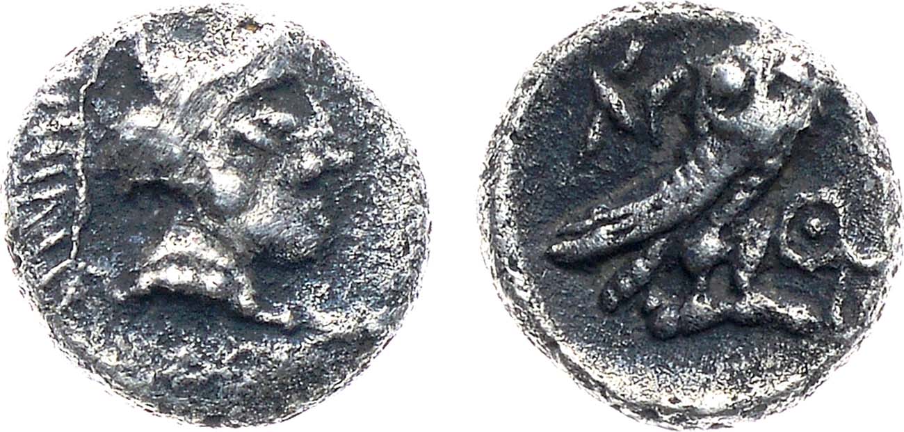 Серебро. 0,53г. Аверс: грубое изображение головы Афины в шлеме. Реверс: стоящая вправо сова, оливковая веточка и полумесяц. VF-.