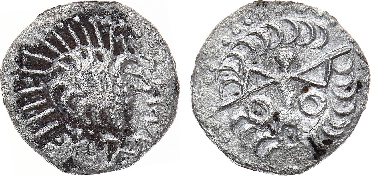 Серебро. 2,25г. Аверс: схематичное изображение головы вправо, моделированное полумесяцами, щека - три вертикальные линии, нос - острый угол; борода и окантовка шеи из точек, перед бородой зигзаги, сверху и слева линии с точками. Реверс: фигура воина с копьём, голова с точками глаз и рта; в поле два круга, по окружности полумесяцы. Клещинов подобна 141. AU.
