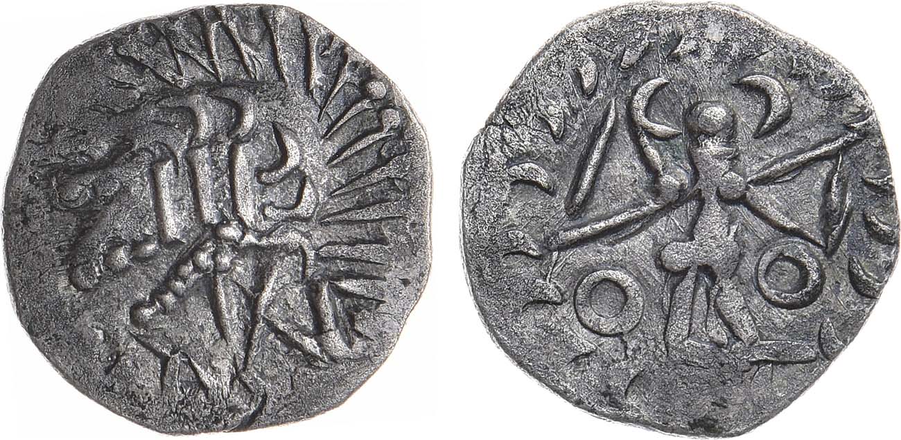 Серебро. 2,82г. Аверс: схематичное изображение головы вправо. Реверс: фигура воина с копьём, по сторонам от головы знаки в виде скобки, внизу справа и слева знаки "О". Клещинов, Муравьёва 574. AU/UNC.