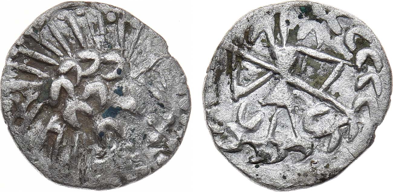 Серебро. 2,38г. Аверс: схематичное изображение головы вправо. Реверс: фигура воина с копьем влево. AU.
