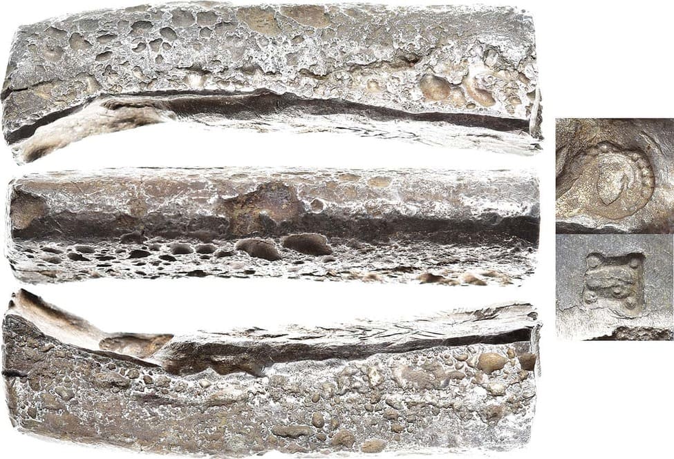 Серебро. 81,87г. Длина: 62 мм; ширина: 14 мм, высота: 17,5 мм. На боковой поверхности имеются небольшие усадочные углубления и следы от литья в два приёма. Края сглажены, прокованы. На верхнюю плоскость слитка нанесено клеймо: голова человека с косами в точечном неполном ободке. На торцевую сторону слитка нанесено клеймо: голова человека с четырьмя точками. Прокопов 147-148, клейма 109, Т32. AU.
