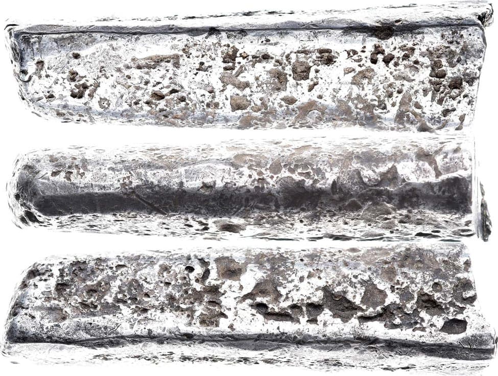 Серебро. 96,12г. Длина: 63 мм; ширина 14 мм. Высота: 17 мм. На боковой поверхности имеются небольшие усадочные углубления и следы от литья в два приёма. Края сглажены, прокованы. Изготовлена в XIV в. Прокопов 42-48. AU.