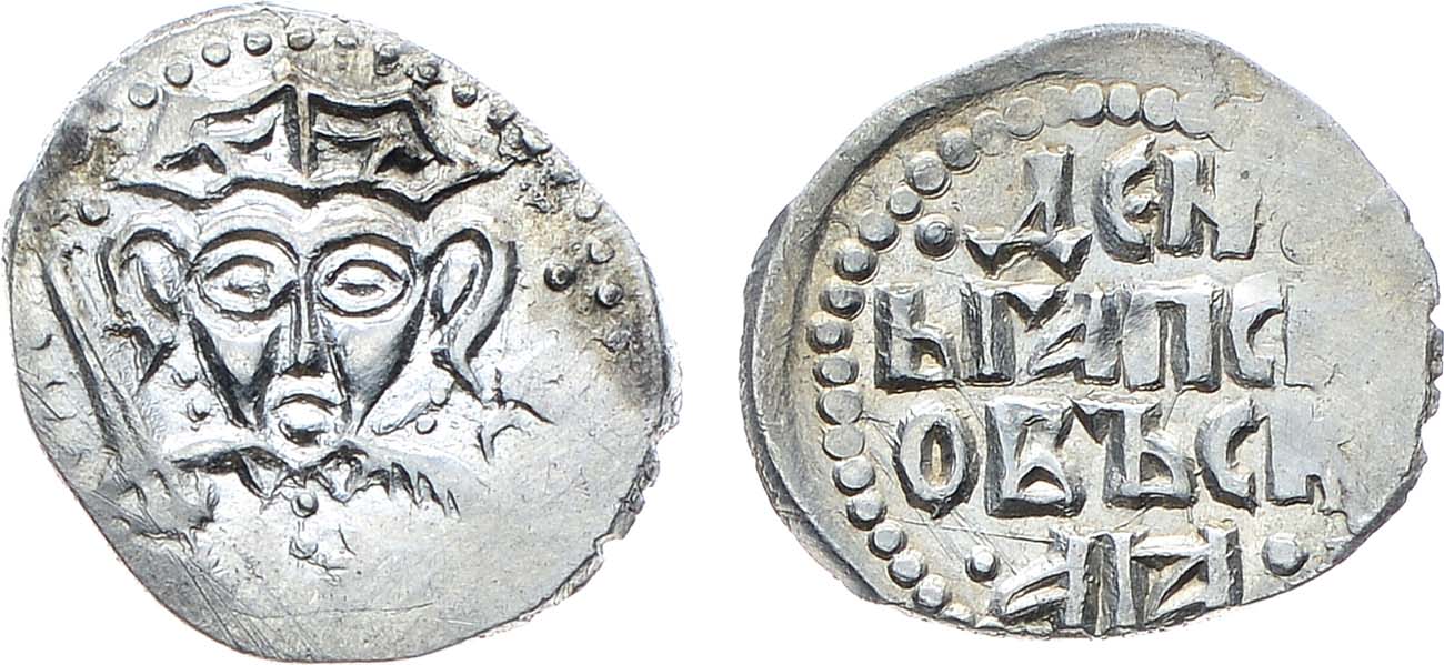 Серебро. 0,79г. Аверс: строчная легенда "ДЄН/ЬГА ПСК/ОВЪСК/АꙖ", точки вокруг. Реверс: князь Довмонт с мечом, монограмма "Ѧ" справа, полумесяцы с обеих сторон точки вокруг. ГП2 7613C (R-IV). UNC.