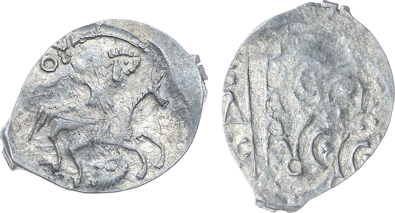Серебро. 0,4г. Москва. Аверс: плетёная легенда "ГДРЬ ВСЄѨ РУСI". Реверс: всадник с занесённой саблей вправо, голова под всадником влево. ГП2 8157C (R-VIII). UNC.
