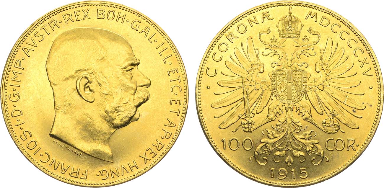 Золото 900 пробы. 33,9г. Вена. KM 2819. UNC.