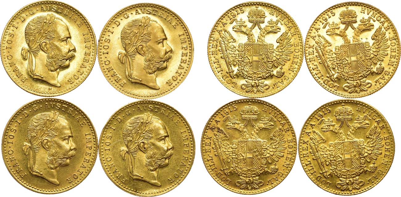 Золото 986 пробы. Дукат 1915 года. 3,44 г. Вена. UNC. Дукат 1915 года. 3,44 г. Вена. Дефект кромки гурта реверса на 9 часов. UNC. Дукат 1915 года. 3,44 г. Вена. UNC-. Дукат 1915 года. 3,5 г. Вена. Деформация кружка, след удара на 6 часов. UNC-. KM 2267.