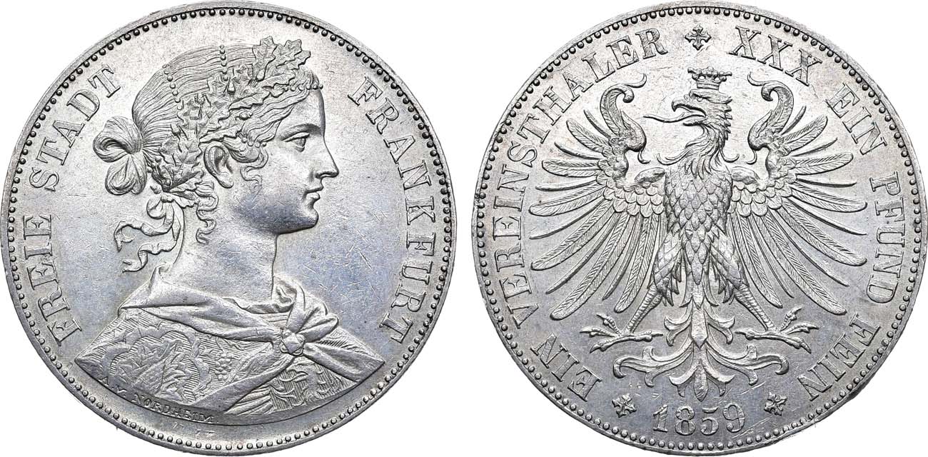 Серебро. 18,52г. Франкфурт-на-Майне. Тираж: 282.889 экз. KM 360. AKS 8. Davenport 649. Jaeger 6. Thun 142. AU/UNC.