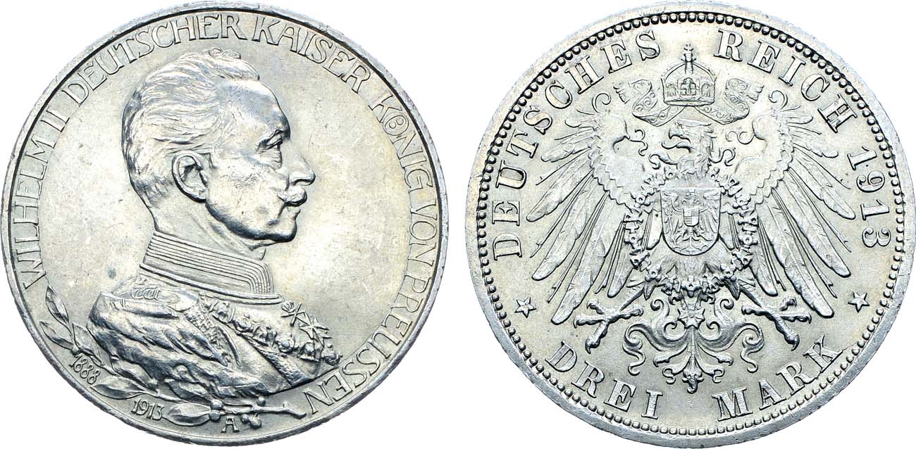 Серебро. 16,64г. Берлин (А). Отчеканена в память 25-летия правления Вильгельма II. KM 535. Jaeger 112. Weege 112. UNC.