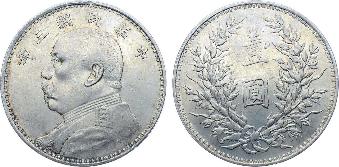 Серебро. 36,77г. Пекин. Третий год Республики. Гурт рубчатый. KM Y329. UNC.