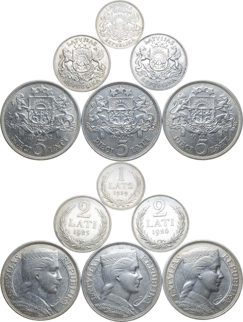Серебро. 1 лат 1924 года. KM 7. AU. 2 лата 1925 года. KM 8. AU. 2 лата 1926 года. KM 7. AU. 5 латов 1929 года. KM 9. AU. 5 латов 1931 года. KM 9. AU. 5 латов 1932 года. KM 9. AU.