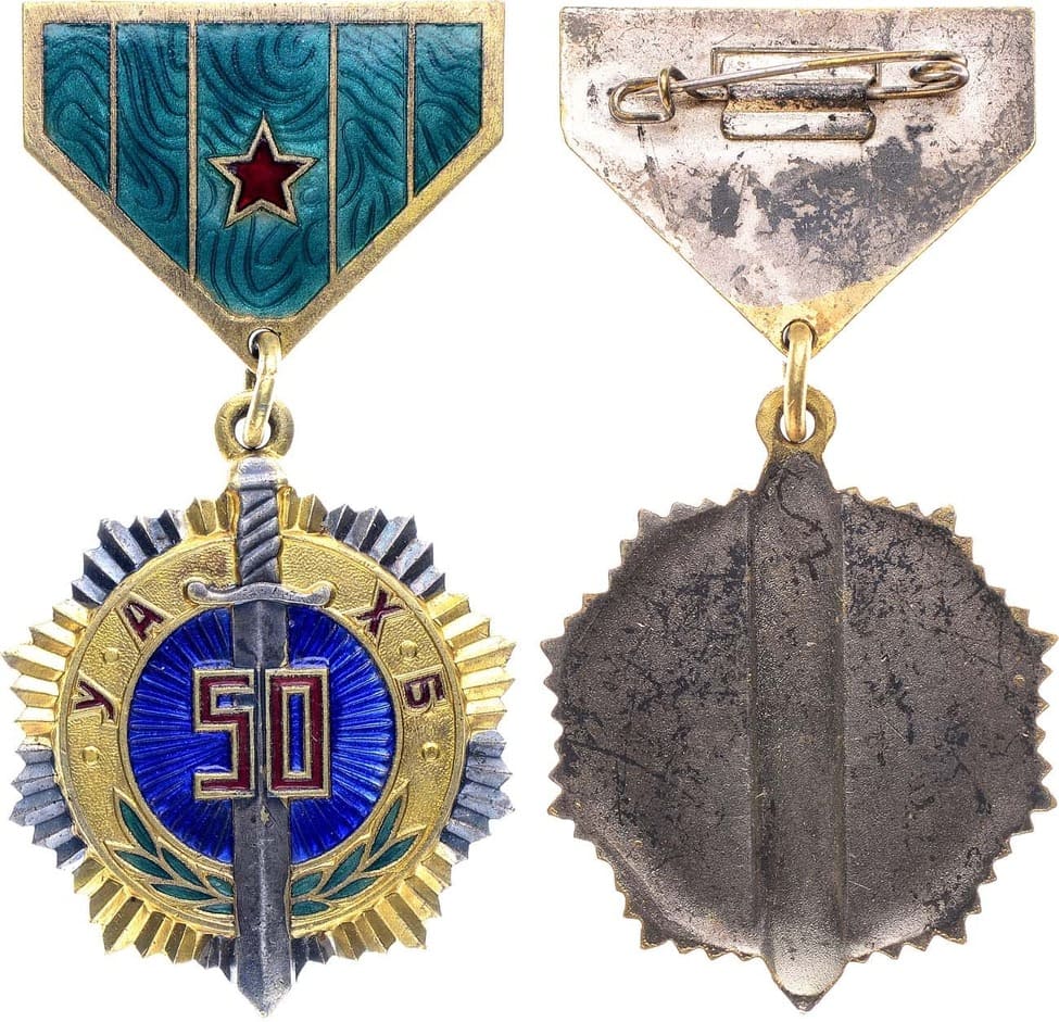 Из старой московской коллекции. Медаль "50 лет органам государственной безопасности" и положение о ней были учреждены Президиумом Великого Народного Хурала 29 октября 1971 года. Проект медали разработал художник Л. Батцэнгэл. Медалью были награждены более 3000 граждан Монголии, в основном офицеры и срочнослужащие органов государственной безопасности и других организаций при министерстве общественной безопасности, находившиеся на действительной военной службе или в отставке, а так же советские сотрудники КГБ, работавшие в МНР, и всё руководство КГБ СССР.
