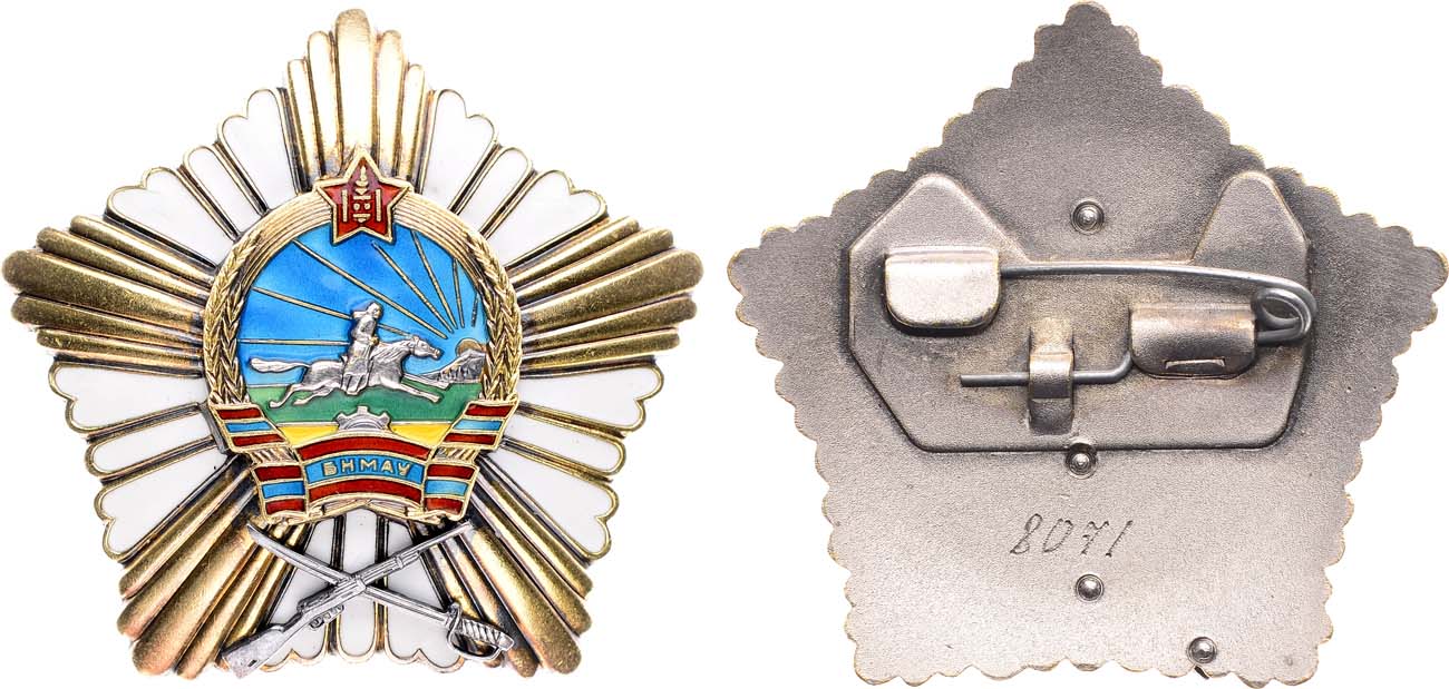 Из старой московской коллекции. Орден "За боевые заслуги" и его статут учреждены Президиумом Малого Государственного Хурала МНР 17 октября 1945 года. Он стал вторым по значимости орденом, которым награждались военнослужащие за подвиги, связанные с защитой Отечества. Проект ордена разработал художник Д. Чойдог. Знак ордена "За боевые заслуги" данного типа вручался с 1986 по 2002 гг.