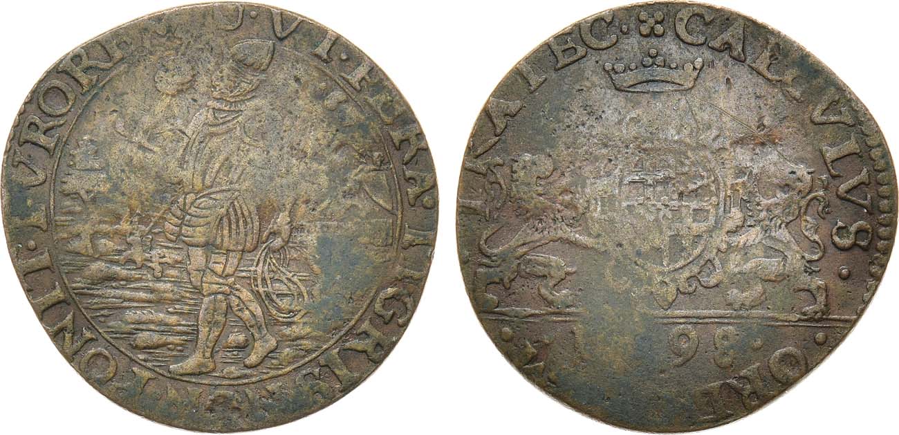 Бронза. 6,09г. Аверс: Мендоса в доспехах с мечом, на котором пронзена голова. Реверс: Коронованный щит Утрехта с легендой: TRAIEC Dugn 3441. F/VF.