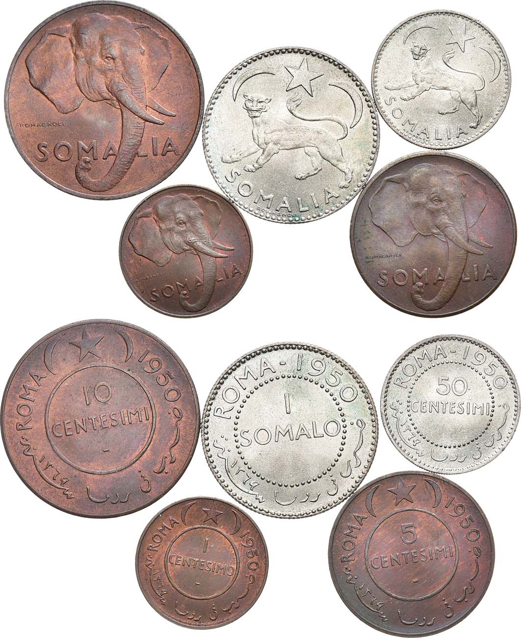1 сомало 1950 года. Серебро. 7,68 г. Рим. KM 5. UNC. 50 чентезимо 1950 года. Серебро. 3,85 г. Рим. KM 4. UNC. 10 чентезимо 1950 года. Латунь. 9,99 г. Рим. KM 3. UNC. 5 чентезимо 1950 года. Латунь. 6,09 г. Рим. KM 2. UNC. 1 чентезимо 1950 года. Латунь. 3,06 г. Рим. KM 1. UNC. UNC.