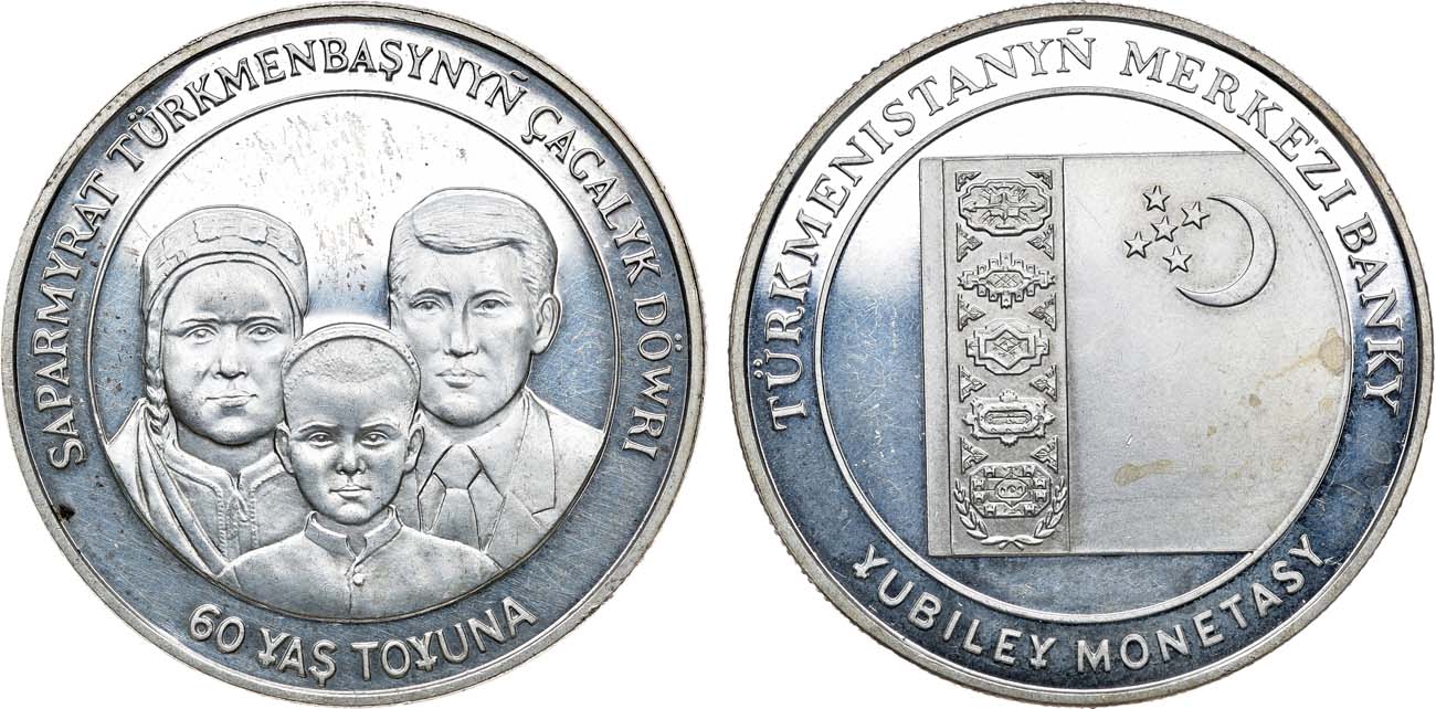 Серебро 925 проба. 28,22г. Ллантризант. Тираж: 1000 экз. Аверс: групповой портрет молодого Сапармурата с отцом и матерью, надпись на туркм. SAPARMYRAT TÜRKMENBAŞYNYÑ ÇAGALYK DÖWRI и туркм. 60 ҰAŞ TOҰUNA. Реверс: фрагмент флага Туркмении, название банка-эмитента, надпись на туркм. ҰUBILEҰ MONETASY. PROOF.