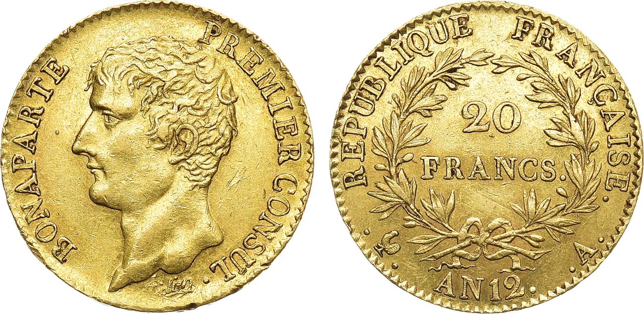 Золото. 6,43г. Париж (A). Реверс: обозначение даты "AN 12". Тираж: 988.244 экз. XF.