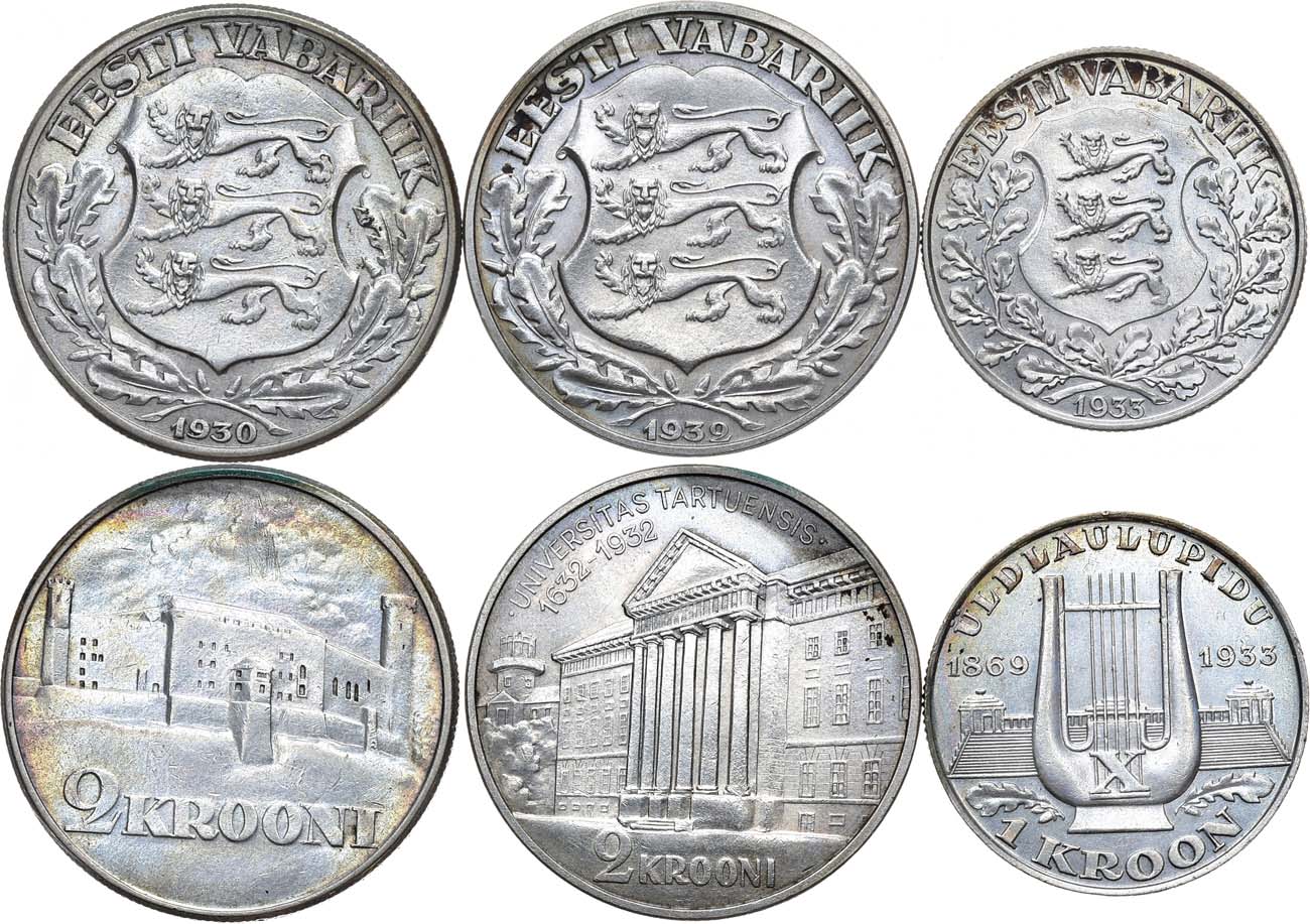 Серебро. 2 кроны 1930 года. Первая республика. Замок Тоомпеа в Таллине. 12,08 г. KM 20. AU. 2 кроны 1932 года. Первая республика. Замок Тоомпеа в Таллине. 12,02 г. KM 20. AU/UNC. 1 крона 1933 года. Первая республика. 10-й песенный фестиваль. 5.97 г. KM 14. UNC