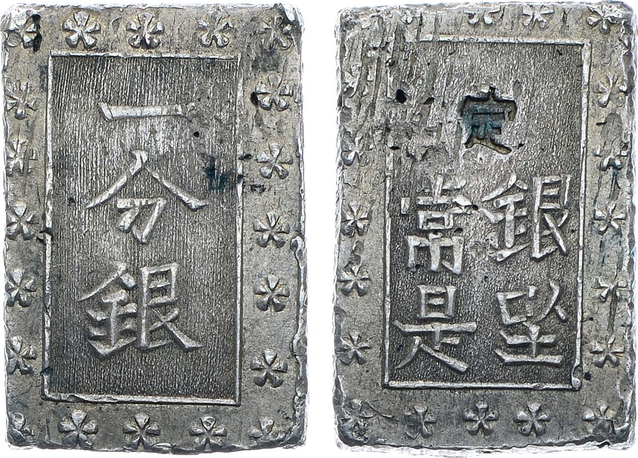 Серебро. 8,65г. Размеры 16х24 мм. Аверс: 一分銀 - Ичи Бу Гин (1 Бу серебром). Реверс: клеймо 定 - Дзё (гарантировано), 常是 - Дзо Зе (официальный монетный двор), 是㘴 - Гин За (серебряный монетный двор). Девиз правления: Ан Сей (安政) 1854-1860 гг - "(Эпоха) Мирного Правления". XF/AU.