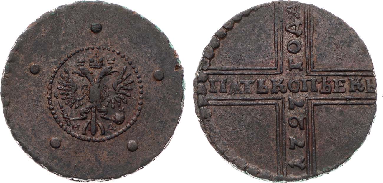 Медь. 21,4г. Набережный монетный двор. Аверс: хвост орла узкий, по 9 перьев в крыльях, орёл крупнее. Уздеников 2460. Биткин 285. Дьяков 84, 20. Brekke 52, 24. AU.
