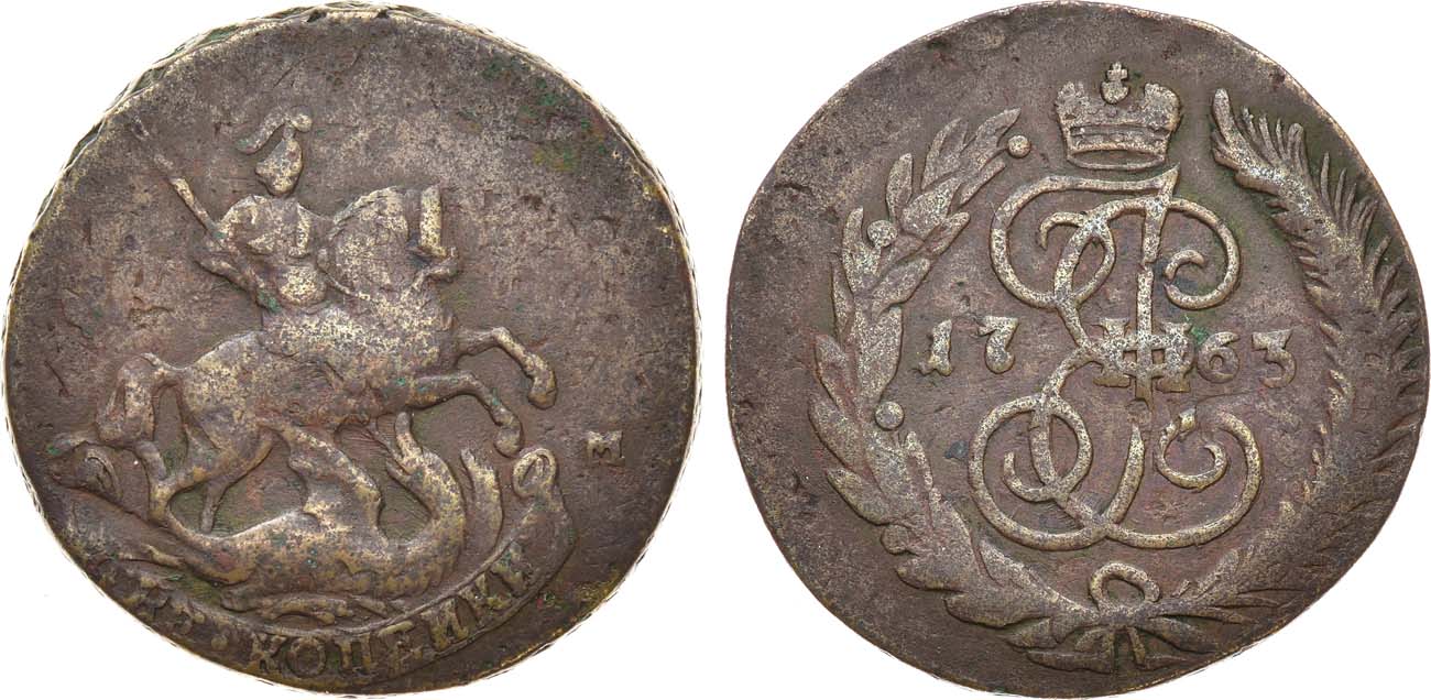 Медь. 18,87г. Санкт-Петербургский монетный двор. Перечекан из 4 копеек 1762 года. Гурт сетчатый. Уздеников 2638. Биткин 580. Дьяков 25, 36. Brekke 117, 139. XF.