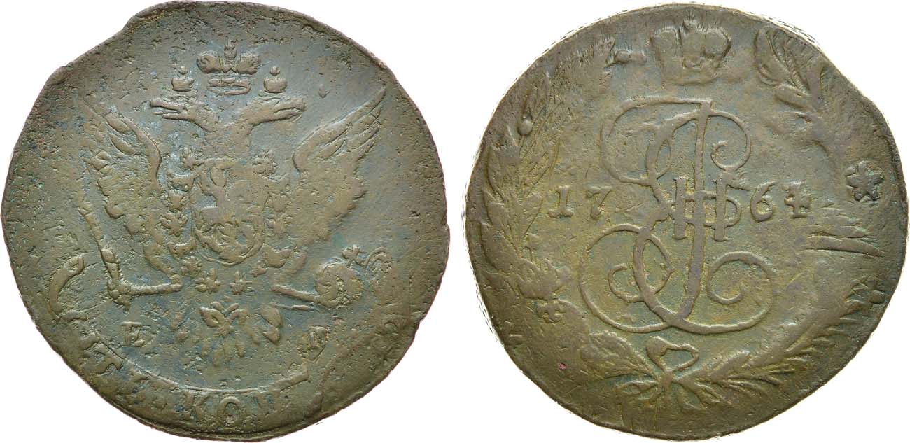 5 копеек 1764 года Екатеринбургского монетного двора, перечеканенные из гривенников 1762 года, встречаются реже, чем аналогичные монеты, перечеканенные на Красном монетном дворе в Москве.