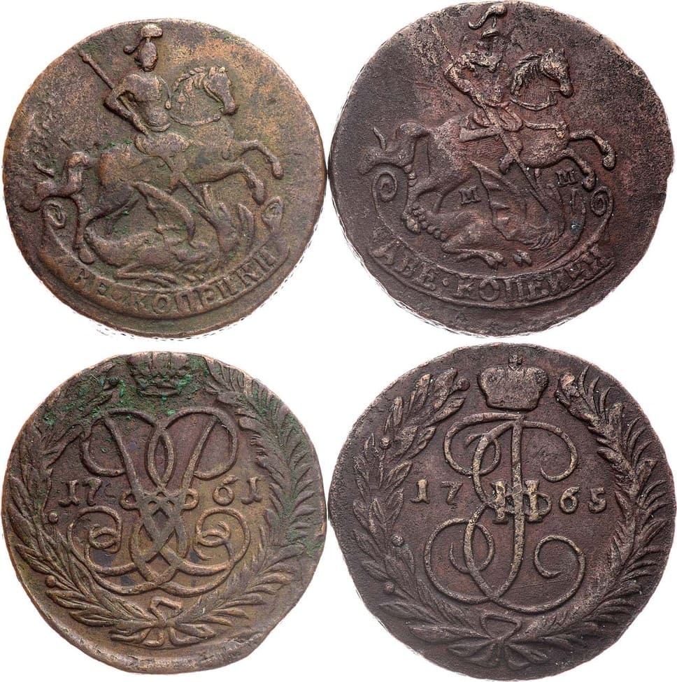 Медь. 2 копейки 1765 года. ММ. Медь. 25,79 г. Красный монетный двор. Уздеников 2667. Биткин 533. Брекке 117. 148. VF/XF. 2 копейки 1761 года. Екатеринбургский монетный двор. Медь. 25,79 г. Уздеников 2619. Биткин 475. Брекке 92. 107. VF/XF.