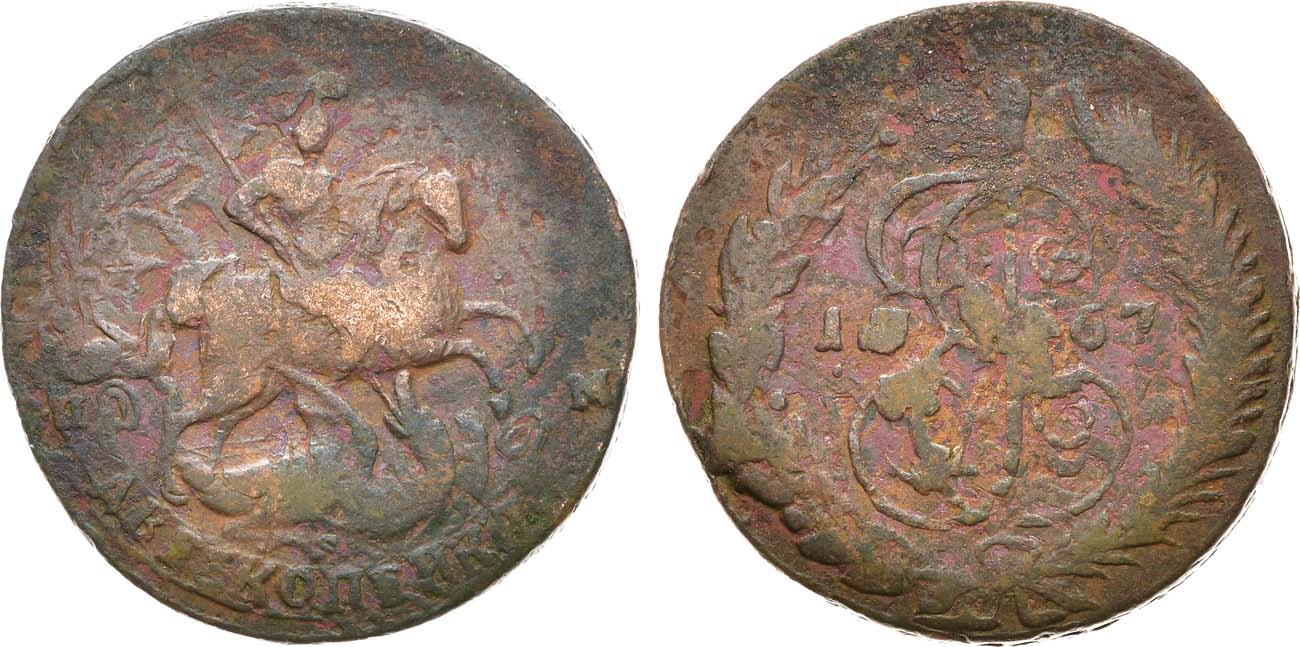 Медь. 22,31г. Санкт-Петербургский монетный двор. Перечекан из 4 копеек 1762 года, которые, в свою очередь, были перечеканены из 2 копеек образца 1757 года. Уздеников 2695(•). Биткин 585(R1). 7 рублей по Петрову. 3 рубля по Ильину. Brekke 117, 159(–). XF.