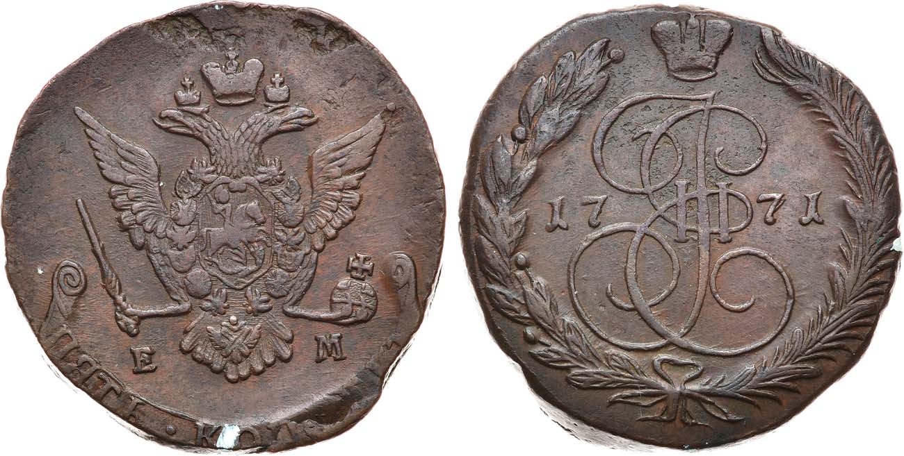 Медь. 44,78г. Аверс: орёл образца 1770-1777 гг. Гурт монеты преимущественно гладкий, с несколькими участками едва нанесённого оформления. Уздеников 2719. Биткин 620а. Дьяков 87, 269. Brekke 119, 229. XF+.