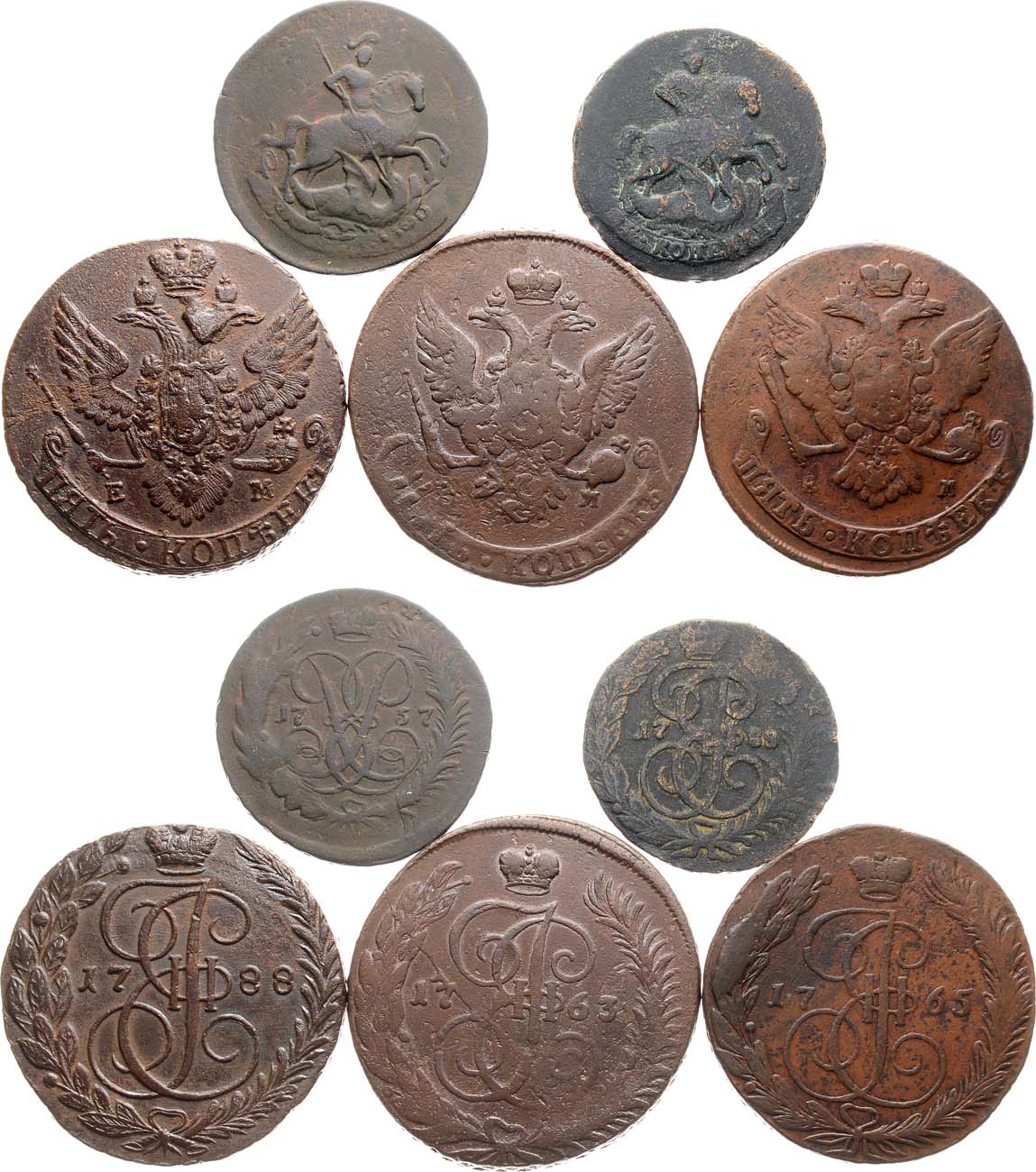 Медь. 5 копеек 1763 г. СПМ. Перечекан. 50,23 г. VF. 5 копеек 1788. ЕМ. 58,99 г. AU. 5 копеек 1765. ЕМ. 51,65 г. XF-. 2 копейки 1757. Перечекан. 20, 48 г. VF. 2 копейки 1788. Перечекан. 13,49 г. VF.