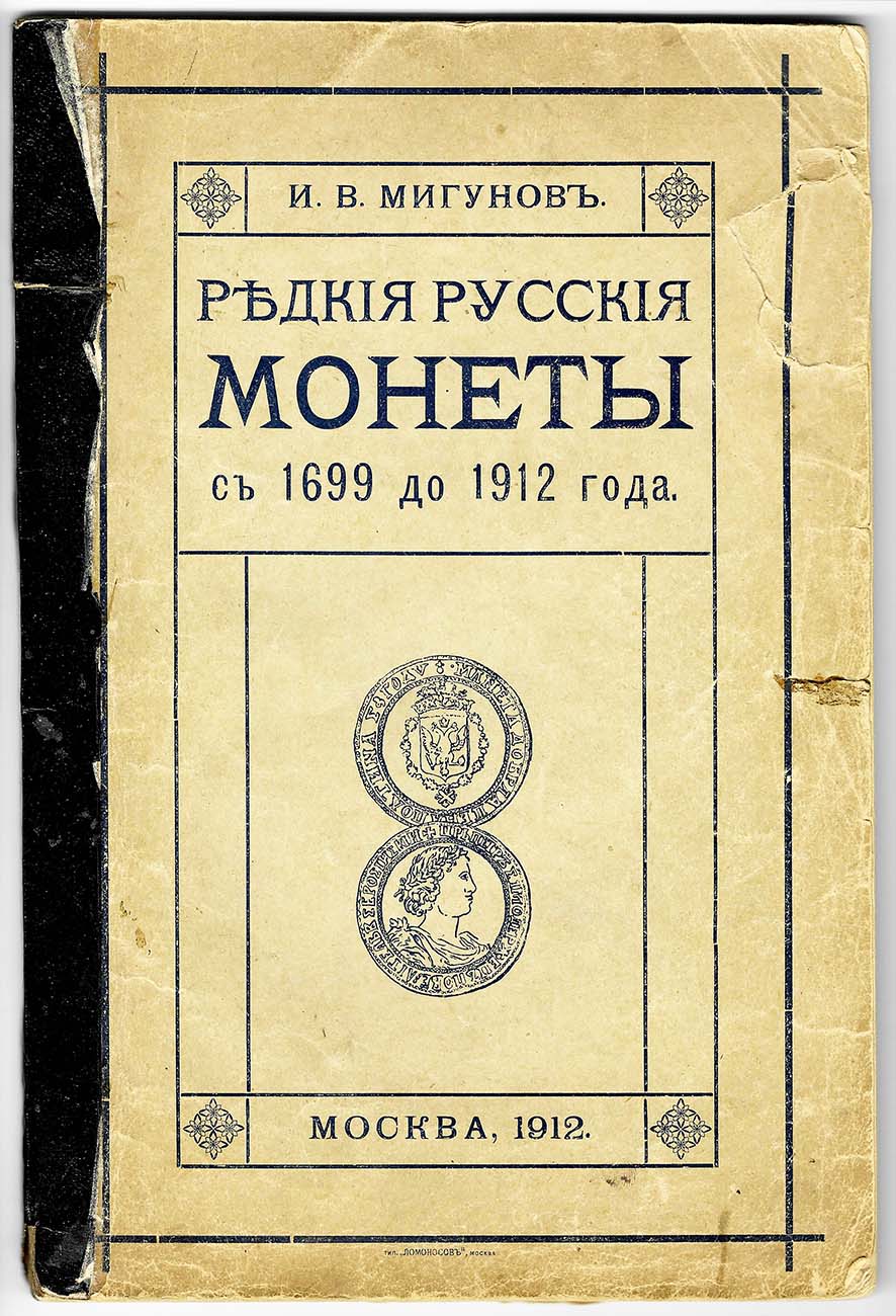 Москва, 1912 год. 96 стр. Самый известный торговый каталог из выпускаемых в России в начале XX века. В нем указаны цены, по которым И.В. Мигунов был готов покупать у населения редкие монеты. Содержит рисунки многих раритетов.