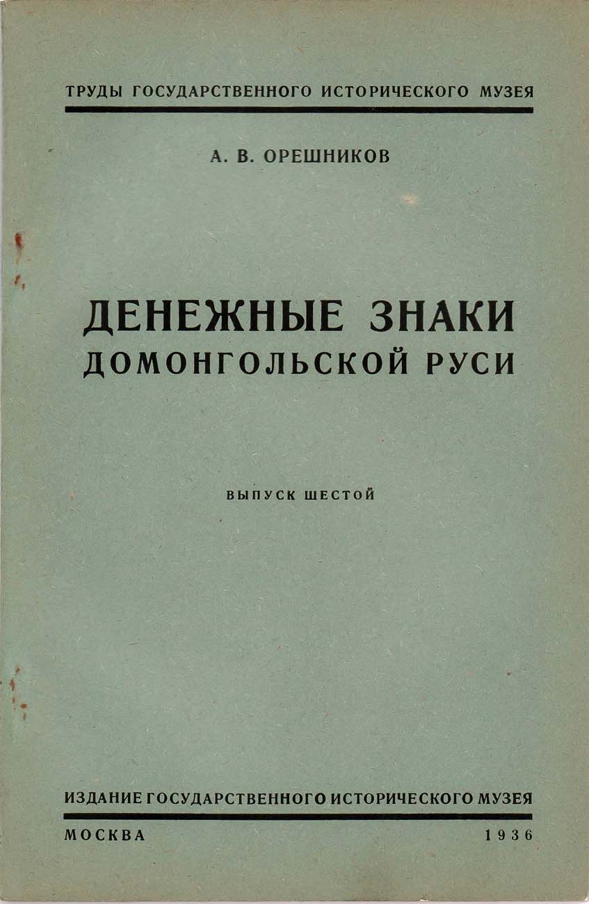 Москва, 1936 г. 96 стр., VI табл. илл. Труды Государственного Исторического музея. Выпуск шестой. В этом выпуске опубликованы неизданные ранее работы классика русской нумизматики Алексея Васильевича Орешникова (1855-1933), отдавшего большую часть своей жизни и всю свою научную деятельность изучению памятников исторического музея.