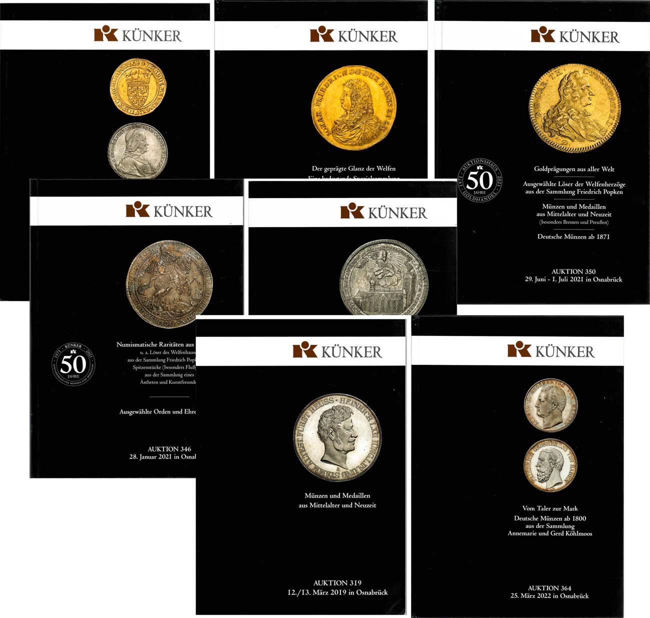 Аукцион 319. Оснабрюк, 12-13 марта 2019 года. Европейски е монеты и медали XVII-XX вв. Аукцион 339. Оснабрюк, 28-29 сентября 2020 года. Коллекция средневековых монет Гюнтера Янсена. 50 лотов русских монет и медалей. Аукционы 346,350. Оснабрюк, 28 июня-1 июля 2021 года. Большое разнообразие редких немецких монет и стран мира, в том числе 60 русских (среди них 10 рублей 1757 работы Дасье с клеймом Эмерика фон Гуттен-Чапского). Красивая подборка русских медалей. Аукцион 361. Оснабрюк, 21 марта 2022 года. Европейски е монеты и медали XVII-XX вв. Аукцион 363, 364. Оснабрюк, 23-25 марта 2022 года. Коллекция средневековых монет Албрехта Ульриха. 62 лота русских монет. Немецкие монеты.