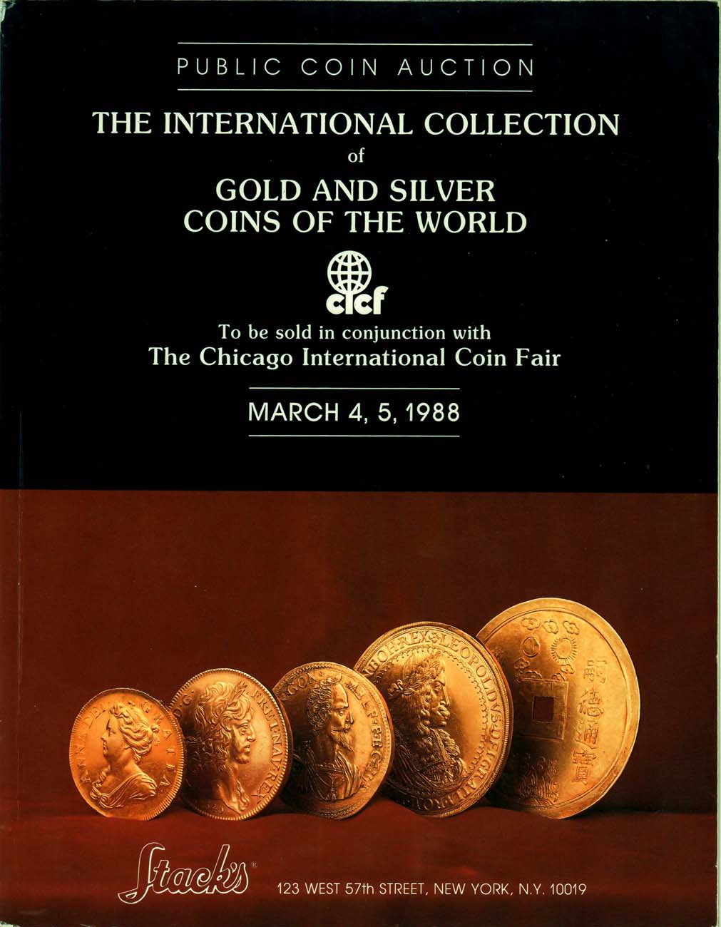 Чикаго, 4-5 марта 1988 года. 323 стр., 2818 лотов. Большая коллекция редких и уникальных золотых монет всего мира. Включает в себя фантастическую по качеству и редкости подборку русских золотых и платиновых монет: двойной червонец 1702 года, червонцы 1712 и 1716 годов, золотые новоделы XVIII века, 10 рублей 1757 года с портретом Ж. Дасье - 2 шт. Уникальные 10 рублей 1809 года, платиновые 12 рублей 1835 года, 37 рублей 50 копеек 1902 шода, 25 рублей 1896 года, империал 1896 ода, полуимпериал 1895 года.