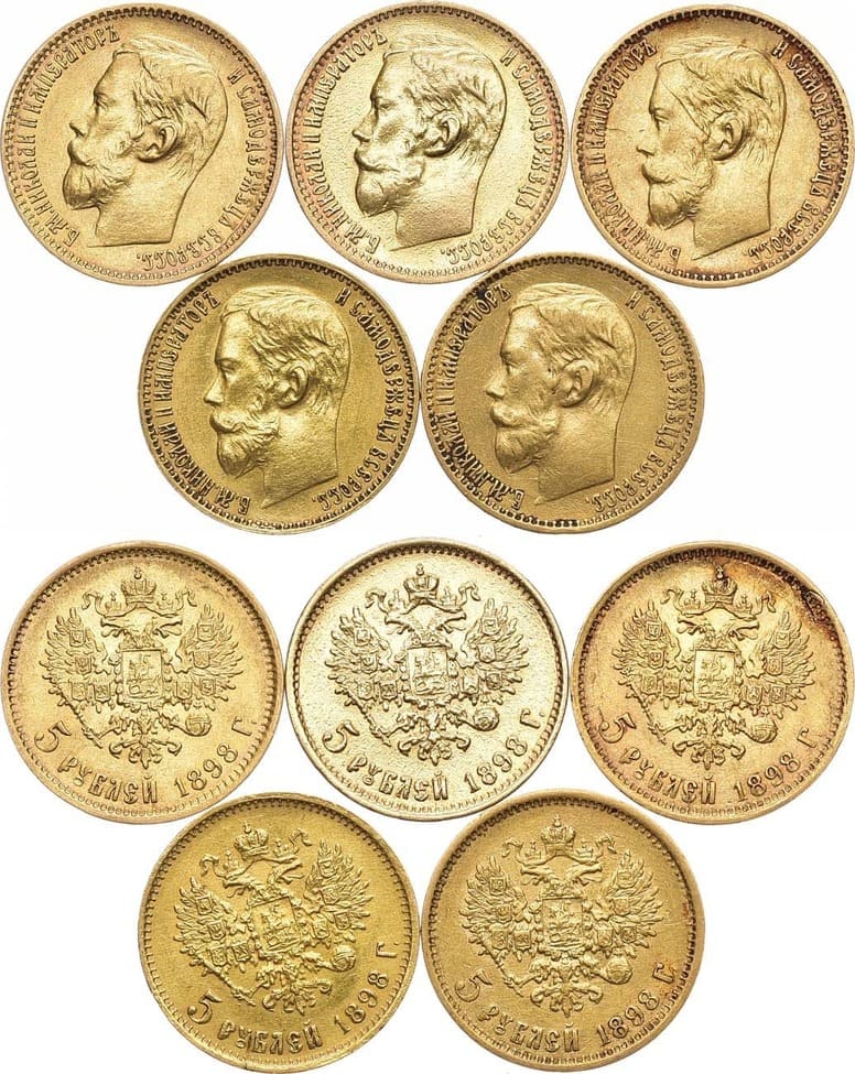 Золото. 5 рублей 1898 года. (АГ). 4,29 г. Портрет 1898 года. Казаков 109. Следы выглаживания полей. XF-. 5 рублей 1898 года. (АГ). 4,27 г. Портрет 1898 года. Казаков 109. Царапины на полях, загрязнение. XF. 5 рублей 1898 года. (АГ). 4,29 г. Портрет 1898 года. Казаков 109. Следы чистки полей, загрязнение. XF. 5 рублей 1898 года. (АГ). 4,3 г. Портрет 1898 года. Казаков 109. AU. 5 рублей 1898 года. (АГ). 4,28 г. Портрет 1898 года. Казаков 109. Следы чистки, загрязнение. XF.