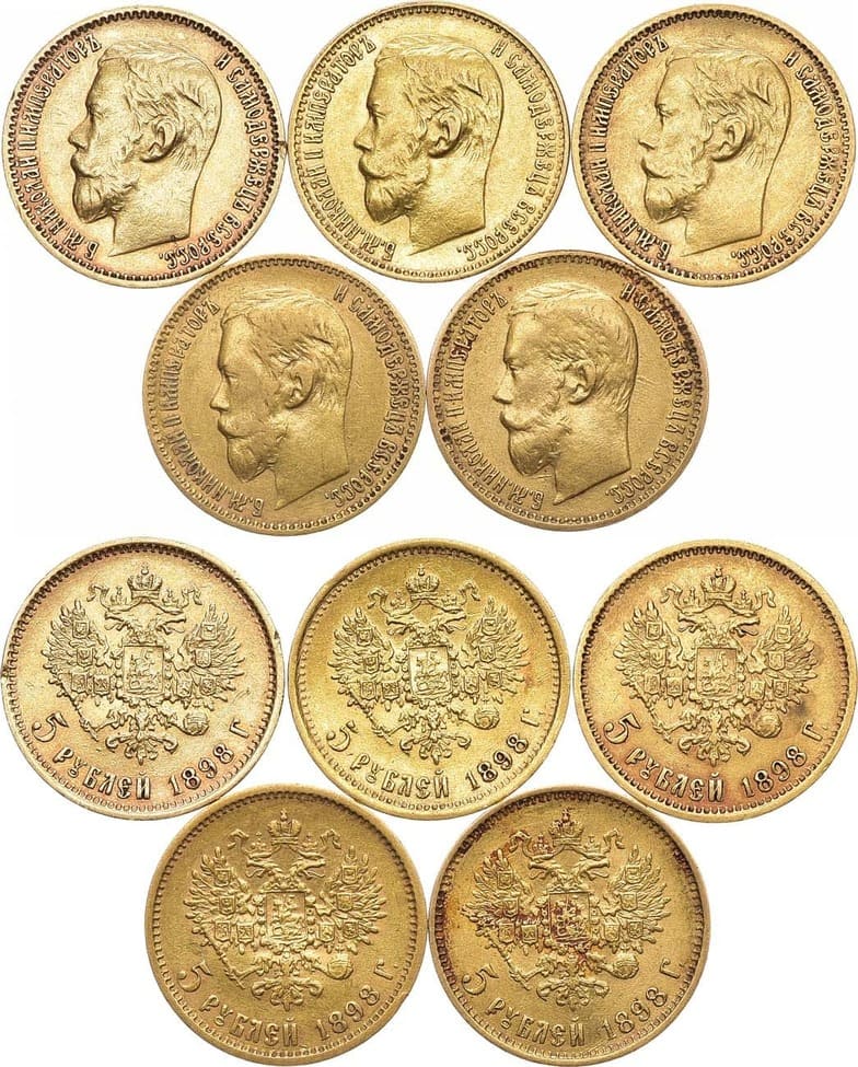 Золото. 5 рублей 1898 года. (АГ). 4,29 г. Портрет 1898 года. Казаков 109. Царапина на поле реверса, патина. XF. 5 рублей 1898 года. (АГ). 4,29 г. Портрет 1898 года. Казаков 109. AU. 5 рублей 1898 года. (АГ). 4,29 г. Портрет 1898 года. Казаков 109. Дефект кромки гурта реверса на 1 час. XF/AU. 5 рублей 1898 года. (АГ). 4,28 г. Портрет 1898 года. Казаков 109. Дефект кромки гурта аверса на 1, 2, 9 часов, реверса 3, 9, 11 часов. XF-. 5 рублей 1898 года. (АГ). 4,3 г. Портрет 1898 года. Казаков 109. Следы чистки, загрязнение. XF.