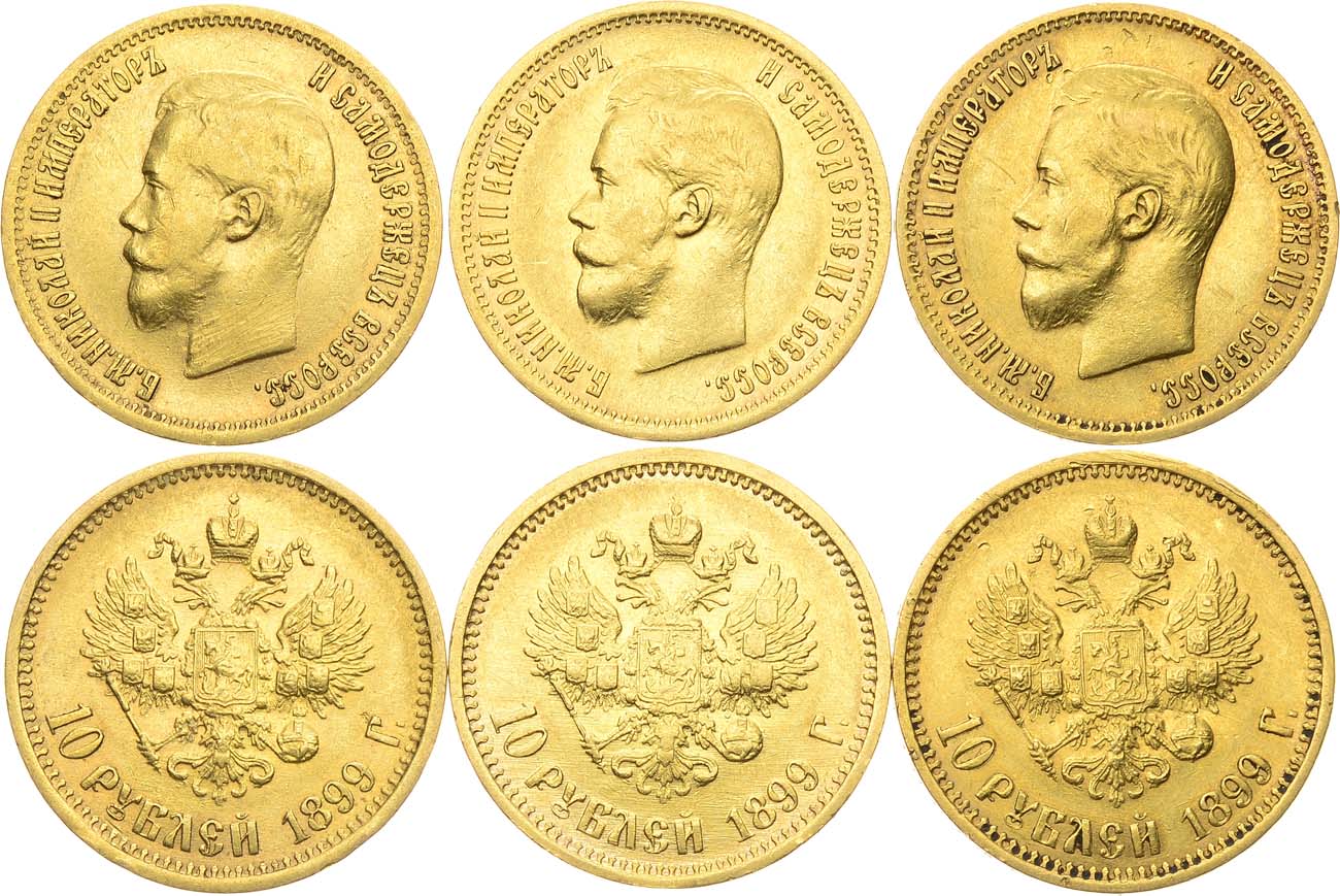 Золото 900 пробы. 10 рублей 1899 года. (А•Г). 8,54 г. Уздеников 0332. Биткин 4. Казаков 149. Царапинки на полях, ударчики по кромке гурта. XF/AU-. 10 рублей 1899 года. (А•Г). 8,59 г. Уздеников 0332. Биткин 4. Казаков 149. AU. 10 рублей 1899 года. (АГ). 8,59 г. Уздеников 0332. Биткин 4. Казаков 150. Царапинки на полях, ударчики по кромке гурта, загрязнение. XF.
