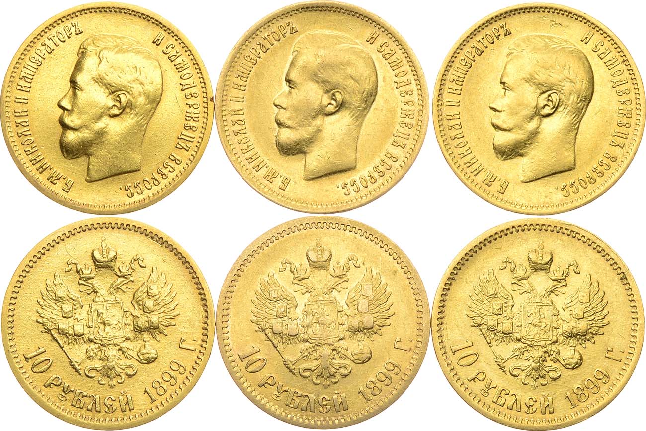 Золото 900 пробы. 10 рублей 1899 года. АГ-(Ф•З). 8,57 г. Уздеников 0334. Биткин 6. Казаков 152. Царапинки на полях. XF/AU-. 10 рублей 1899 года. АГ-(Ф•З). 8,54 г. Уздеников 0334. Биткин 6. Казаков 152. Царапинки на полях. XF. 10 рублей 1899 года. АГ-(Ф•З). 8,54 г. Уздеников 0334. Биткин 6. Казаков 152. Царапинки на полях, запил кромки гурта аверса на 9 часов. XF.