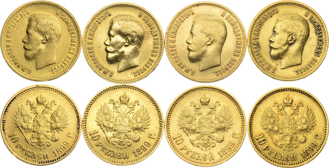 Золото 900 пробы. 10 рублей 1899 года. АГ-(А•Г). 8,58 г. Уздеников 0332. Биткин 4. Казаков 149. Царапинки на полях. XF. 10 рублей 1899 года. АГ-(А•Г). 8,61 г. Уздеников 0332. Биткин 4. Казаков 149. Царапины на полях, забоинки по кромкам гурта, загрязнение. XF. 10 рублей 1899 года. АГ-(АГ). 8,59 г. Уздеников 0332. Биткин 4. Казаков 150. Царапинки на полях, забоинки по кромкам гурта, загрязнение. XF. 10 рублей 1899 года. АГ-(АГ). 8,56 г. Уздеников 0332. Биткин 4. Казаков 150. Царапинки на полях, забоинки по кромкам гурта, загрязнение. VF/XF.